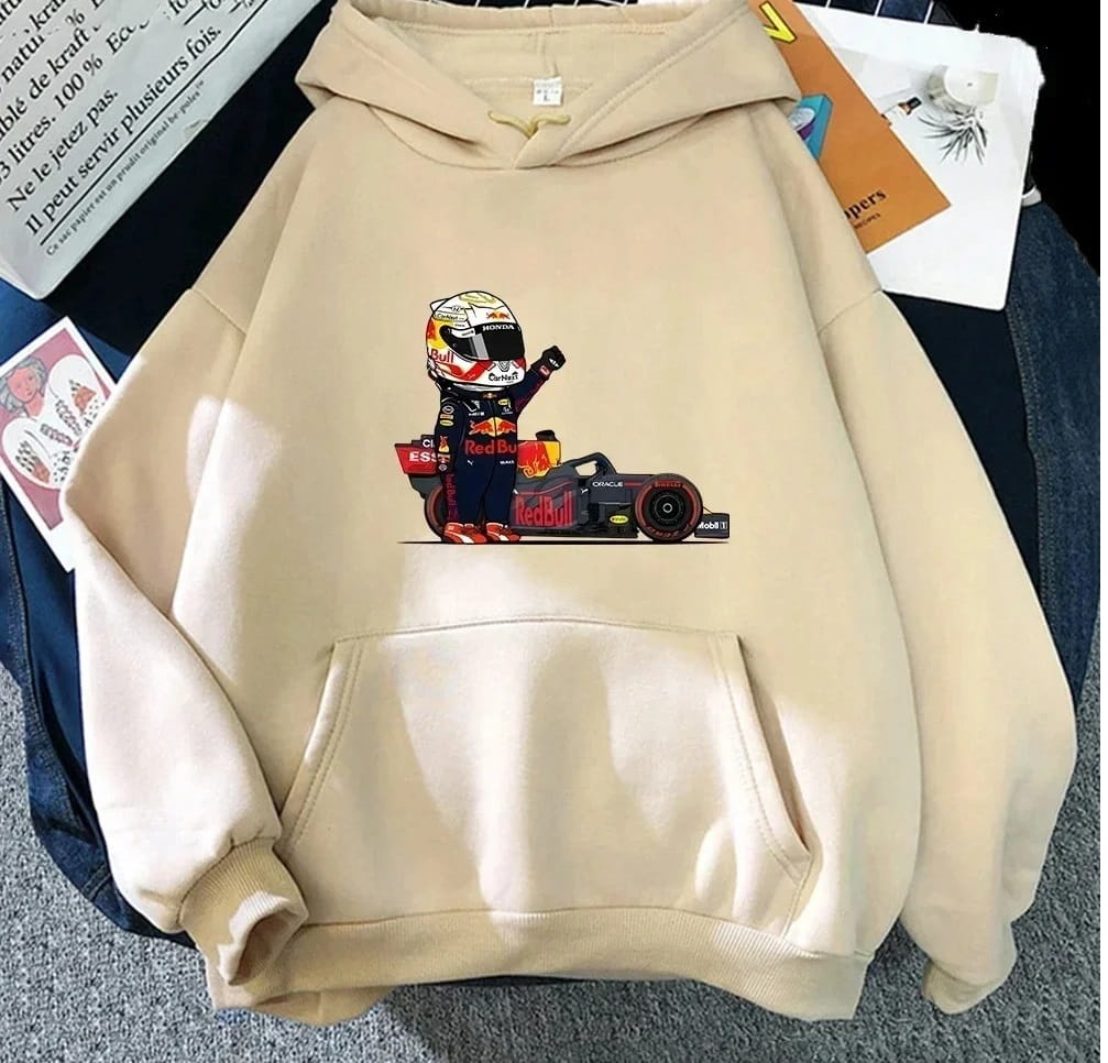• Wyjątkowa Grafika: Na froncie bluzy widnieje urocza, stylizowana grafika Maxa Verstappena w kombinezonie Red Bulla obok jego bolidu F1. Dostępna w klasycznych kolorach.