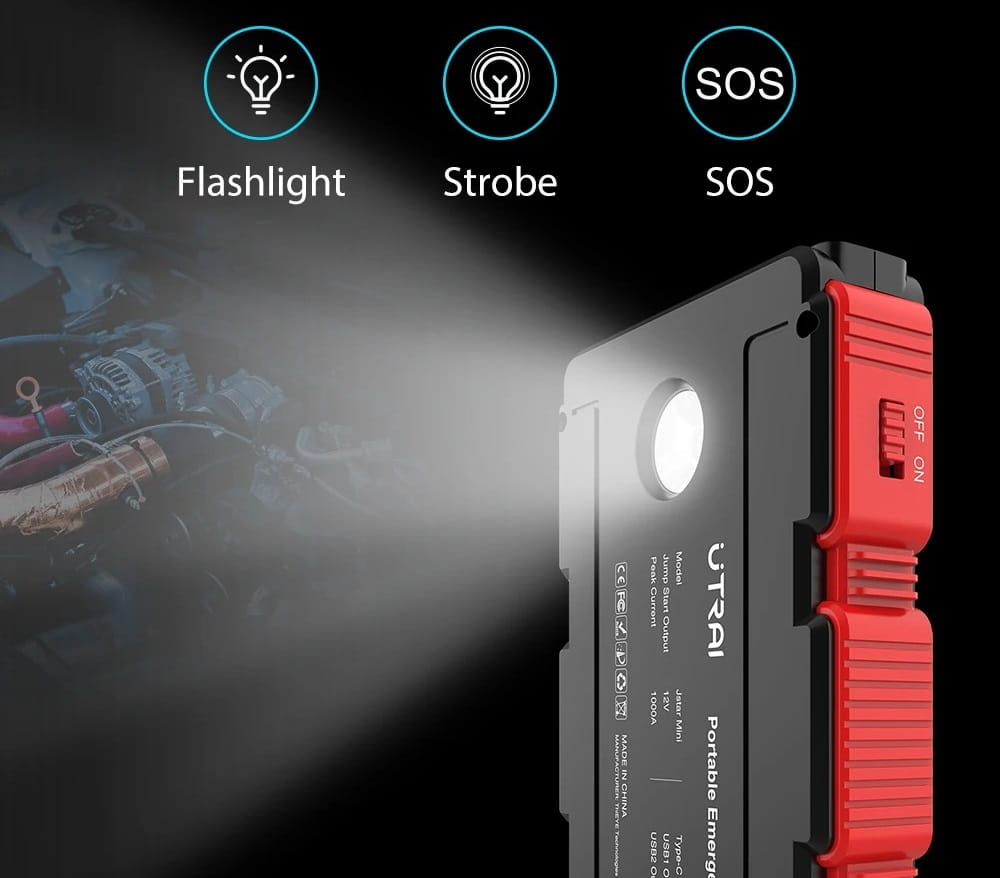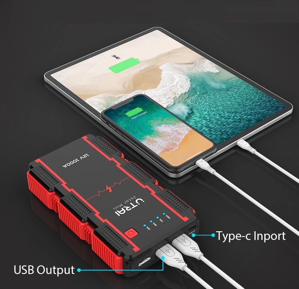 Jump starter może również służyć jako power bank - posiada 2 wyjścia USB + C, dzięki czemu można ładować baterie w smartfonie, laptopie, tablecie, itp.