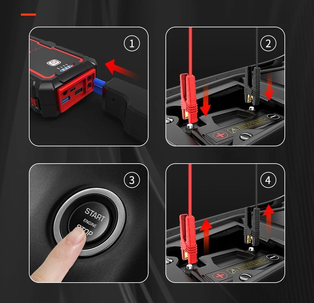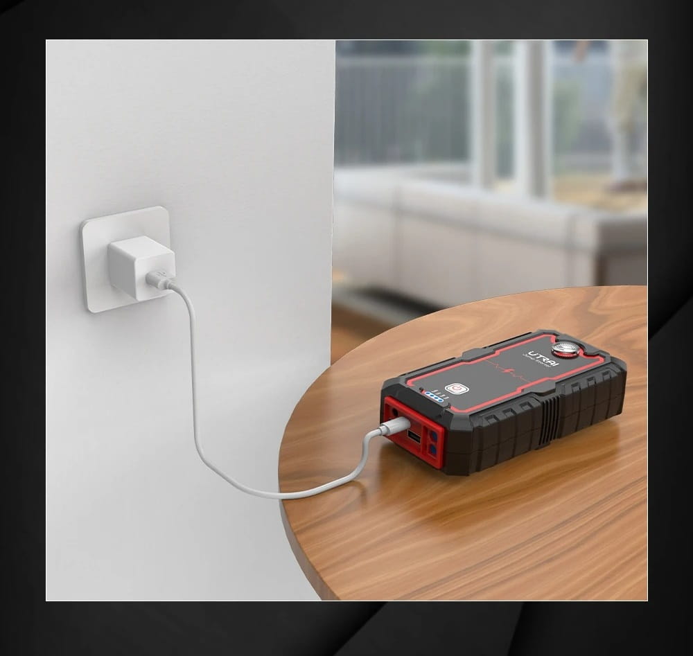 Jump starter może również służyć jako power bank - posiada 2 wyjścia USB + C, dzięki czemu można ładować baterie w smartfonie, laptopie, tablecie, itp.