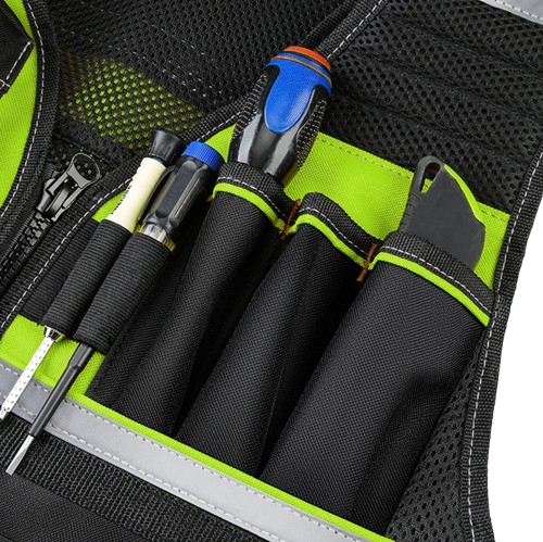 - Liczne kieszenie o różnych rozmiarach i kształtach umożliwiają przechowywanie narzędzi, śrub, gwoździ, telefonów komórkowych i innych niezbędnych przedmiotów.
