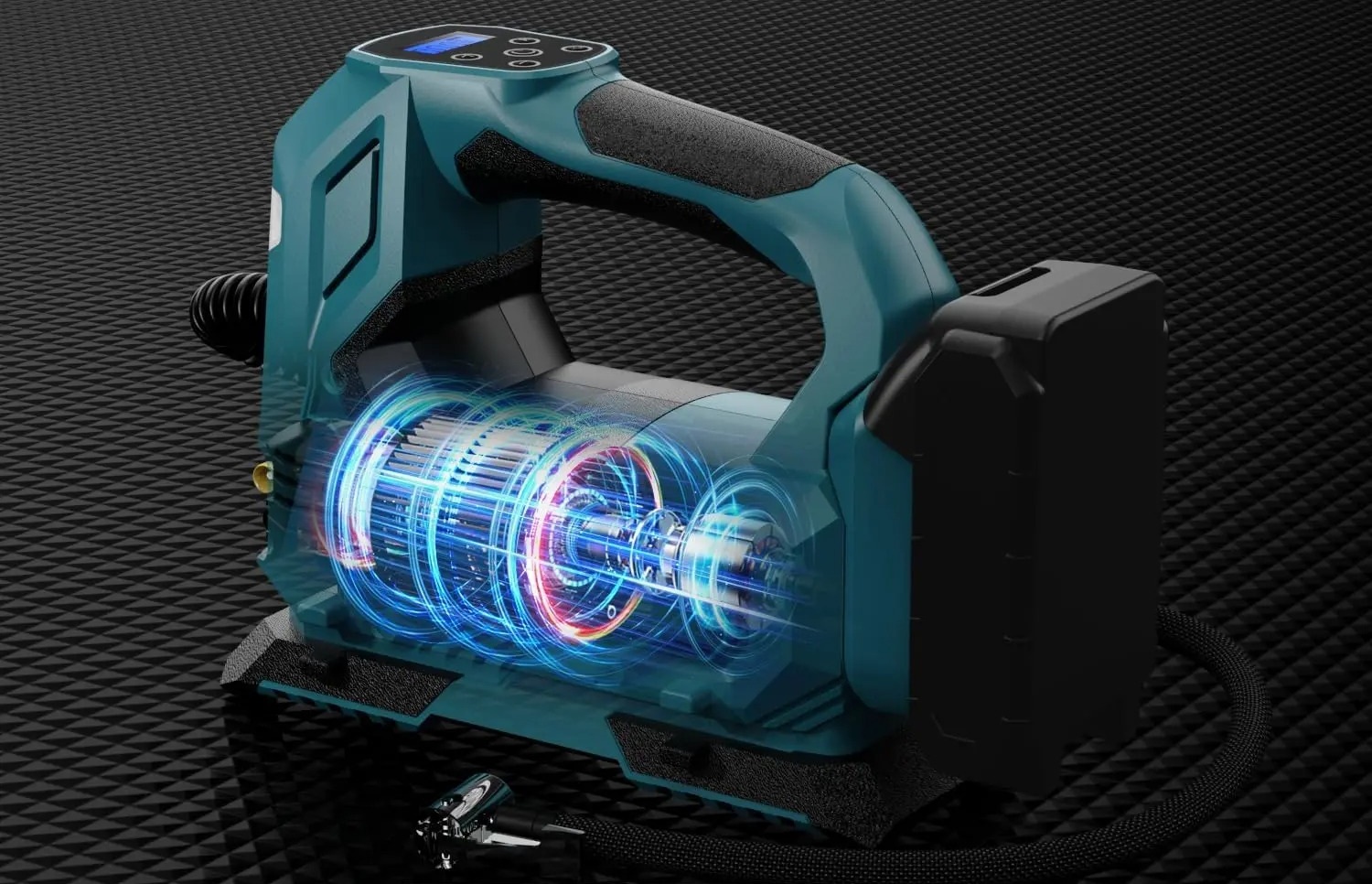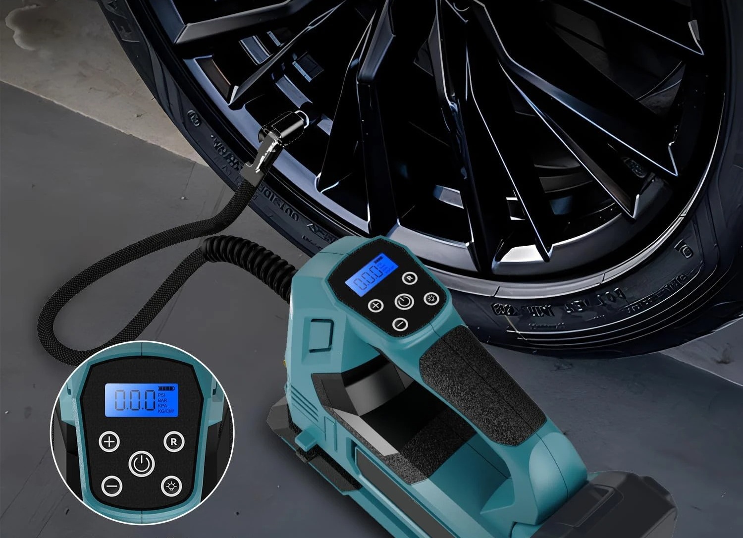 Inteligentny System Auto-Stop: Wystarczy ustawić żądane ciśnienie na cyfrowym wyświetlaczu LCD. Kompresor samoczynnie wyłączy się po osiągnięciu celu, co gwarantuje bezpieczeństwo i precyzję.