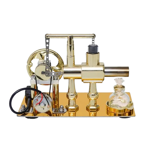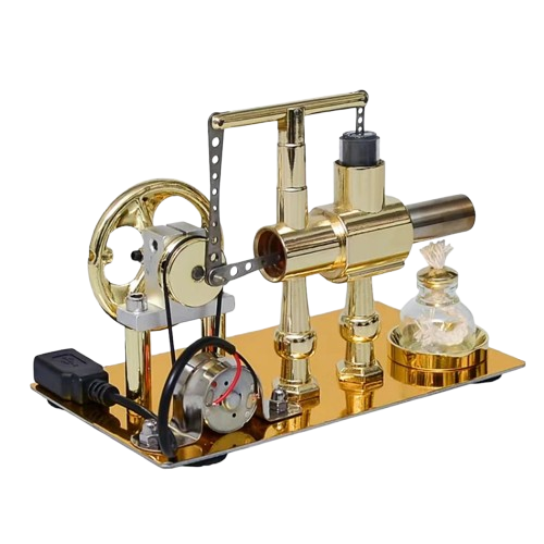 Model silnika zasilanego gorącym powietrzem, replika silnika Sterlinga, działa na zasadzie różnicy temperatur. Gorące powietrze napędza tłoki, które zamieniają energię cieplną na mechaniczną. Jest cichy, efektywny i ekologiczny, idealny do edukacji i miniaturowych zastosowań.