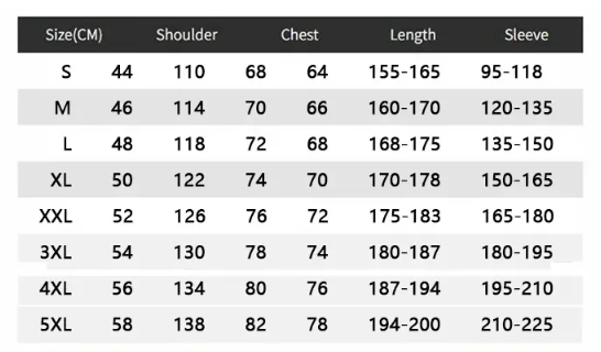 | Rękaw | 95-118 | 120-135 | 135-150 | 150-165 | 165-180 | 180-195 | 195-210 | 210-225 |