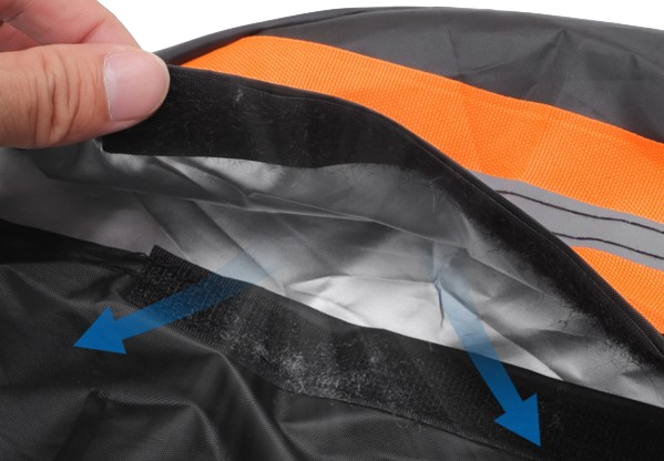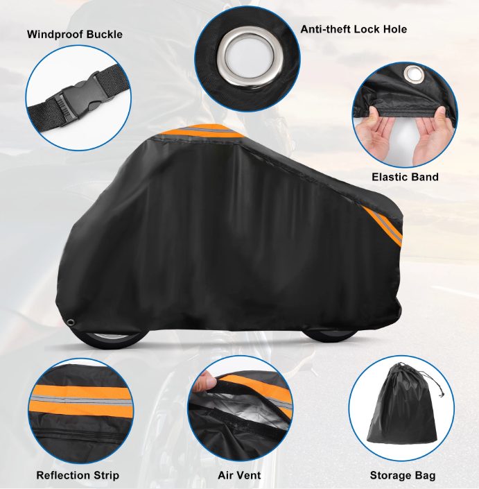Uniwersalny pokrowiec na motocykl w kolorze czarnym, wykonany z wodoodpornego materiału, idealnie chroni pojazd przed deszczem i innymi niekorzystnymi warunkami atmosferycznymi. Dzięki uniwersalnemu rozmiarowi pasuje do większości modeli motocykli. Solidne zamki i elastyczne paski zapewniają stabilne oraz bezpieczne przymocowanie pokrowca.