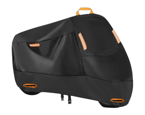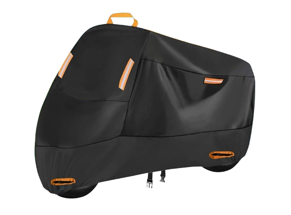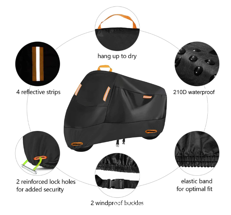 Uniwersalny pokrowiec na motocykl w kolorze czarnym, wykonany z wodoodpornego materiału, idealnie chroni pojazd przed deszczem i innymi niekorzystnymi warunkami atmosferycznymi. Dzięki uniwersalnemu rozmiarowi pasuje do większości modeli motocykli. Solidne zamki i elastyczne paski zapewniają stabilne oraz bezpieczne przymocowanie pokrowca.