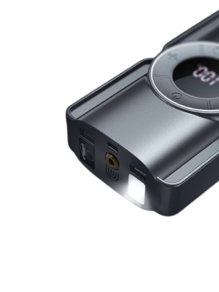 Jump Starter ze sprężarką powietrza to praktyczne narzędzie, które pozwala na rozruch wyczerpanej baterii samochodowej, pompowanie opon, ładowanie smartfonu oraz latarkę.