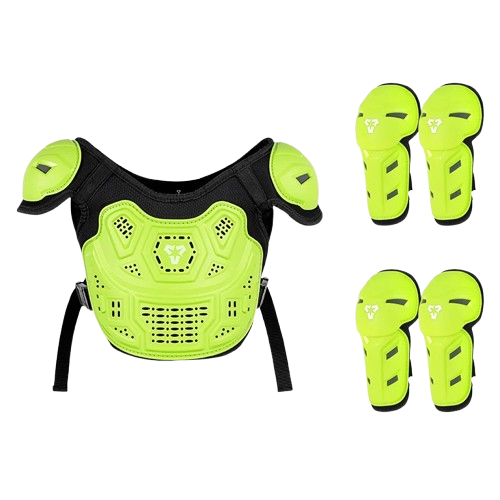 • Pełna Ochrona 360°: Zestaw zawiera kamizelkę ochronną na klatkę piersiową i plecy oraz komplet czterech ochraniaczy na łokcie i kolana.