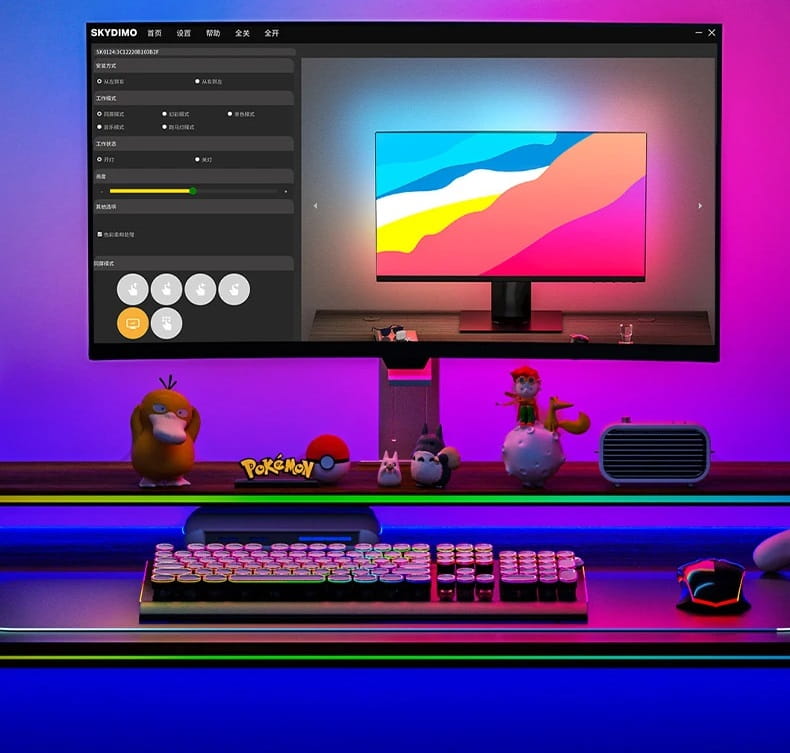 Zestaw ten umożliwia stworzenie efektownego, nastrojowego podświetlenia wokół monitora. Taśma LED RGB jest łatwa w montażu za pomocą dołączonego mocowania. Sterowanie kolorem i trybem oświetlenia odbywa się za pomocą pilota lub aplikacji. Zestaw zapewnia nie tylko przyjemne doznania wizualne, ale również redukuje zmęczenie oczu podczas długich godzin pracy przy komputerze.