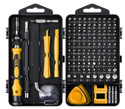 Zestaw precyzyjnych narzędzi składa się z 122 elementów, które zapewniają wysoką jakość i precyzję pracy. Zestaw zawiera pęsetę, klucz ze zmiennymi wkrętami oraz inne akcesoria niezbędne do wykonywania precyzyjnych napraw.